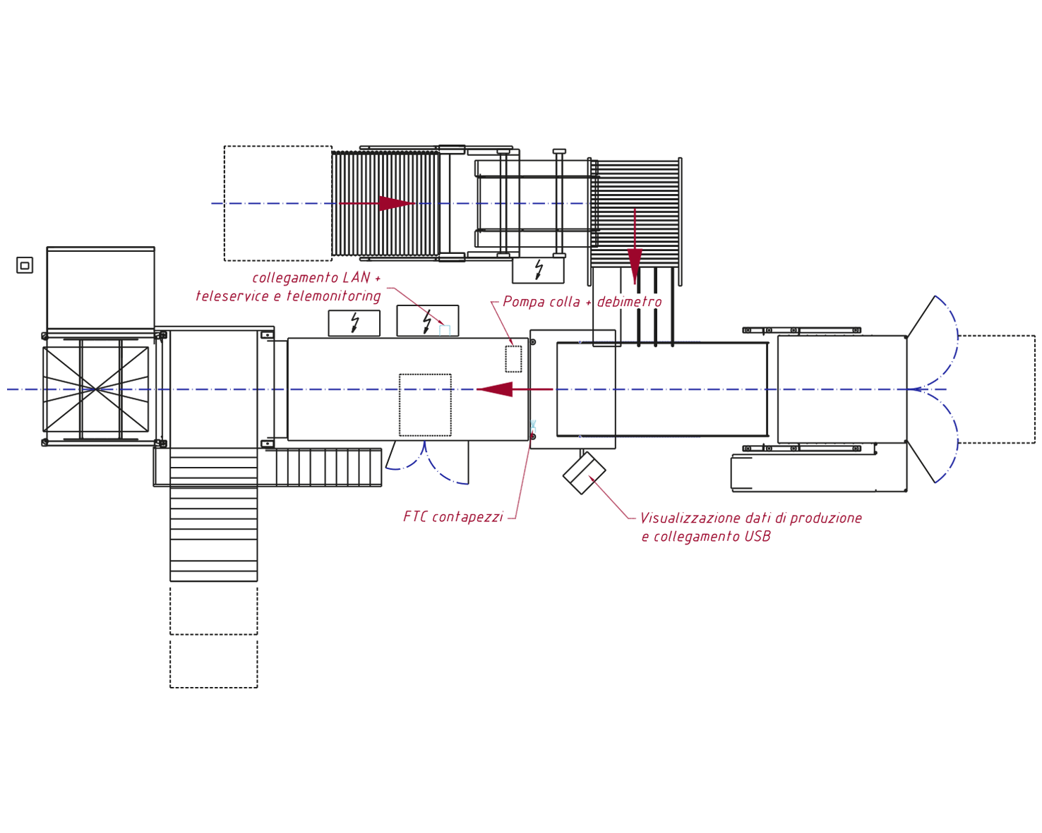 Dopo l’impilatore è presente un sistema logistico in grado di gestire fino a 6 pile le quali vengono trasportate fino al mettifoglio dell’accoppiatrice Sintesy il quale risulta costantemente alimentato da un flusso di fogli, evitando eventuali interruzioni
